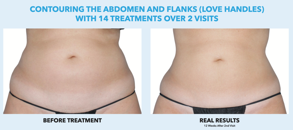 Body contouring treatments, like CoolSculpting® Elite, work using a non-invasive process called cryolipolysis. This process freezes the fat cells, destroying them from the outside in. As a result, areas on the body will appear to be contoured or shaped, revealing the muscle underneath. This result will be more obvious as the fat cells are naturally filtered by the body over the weeks after treatment.